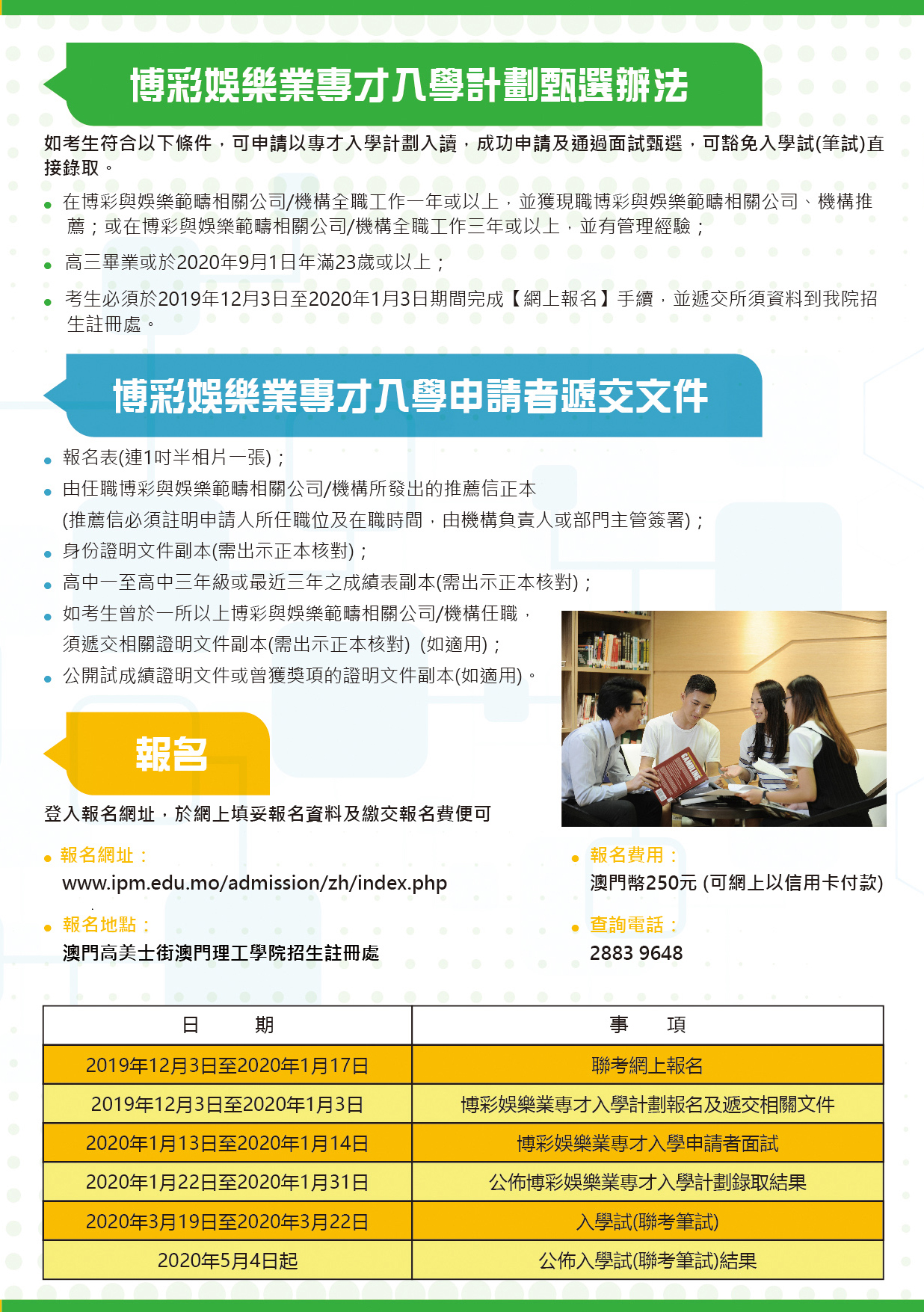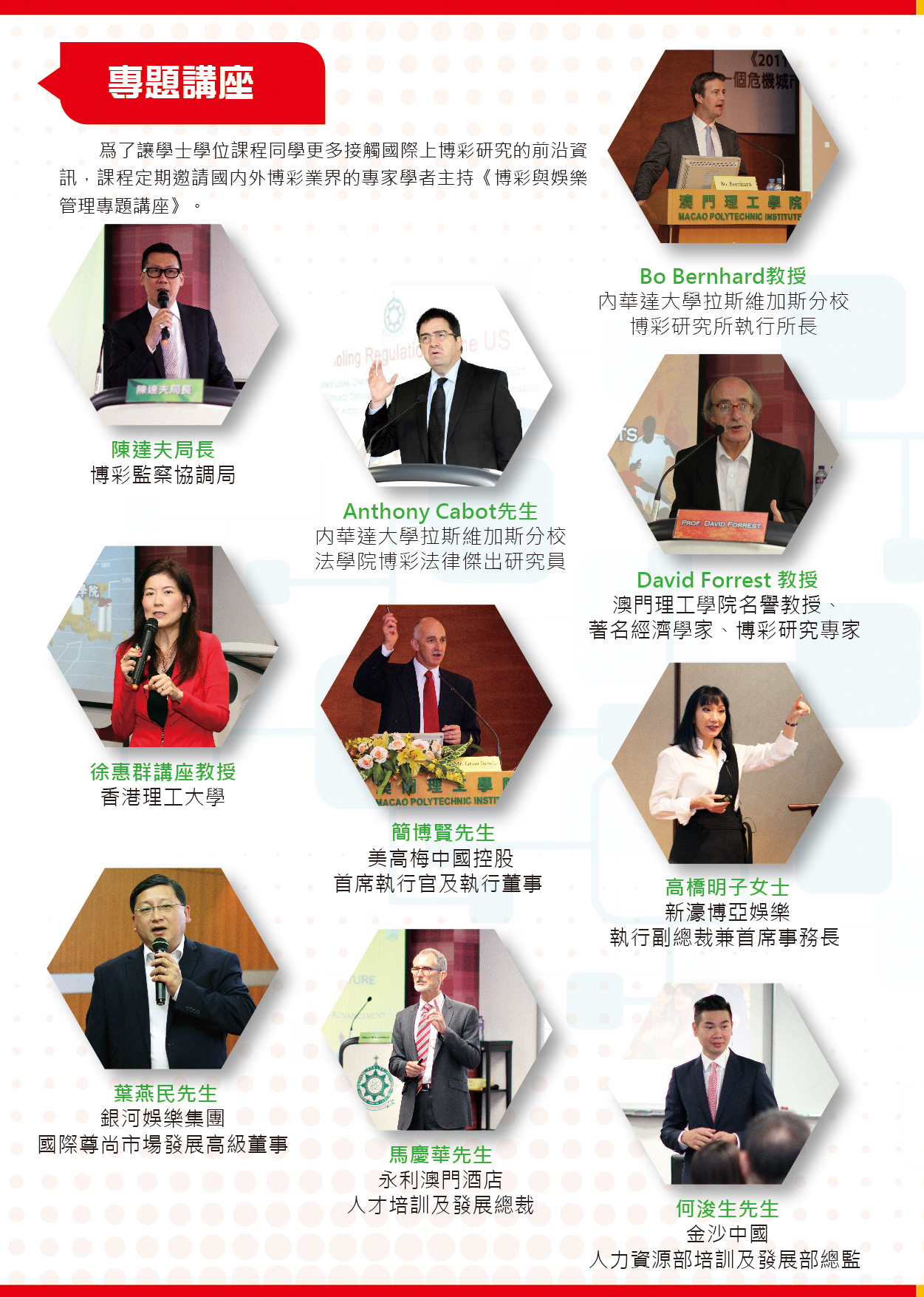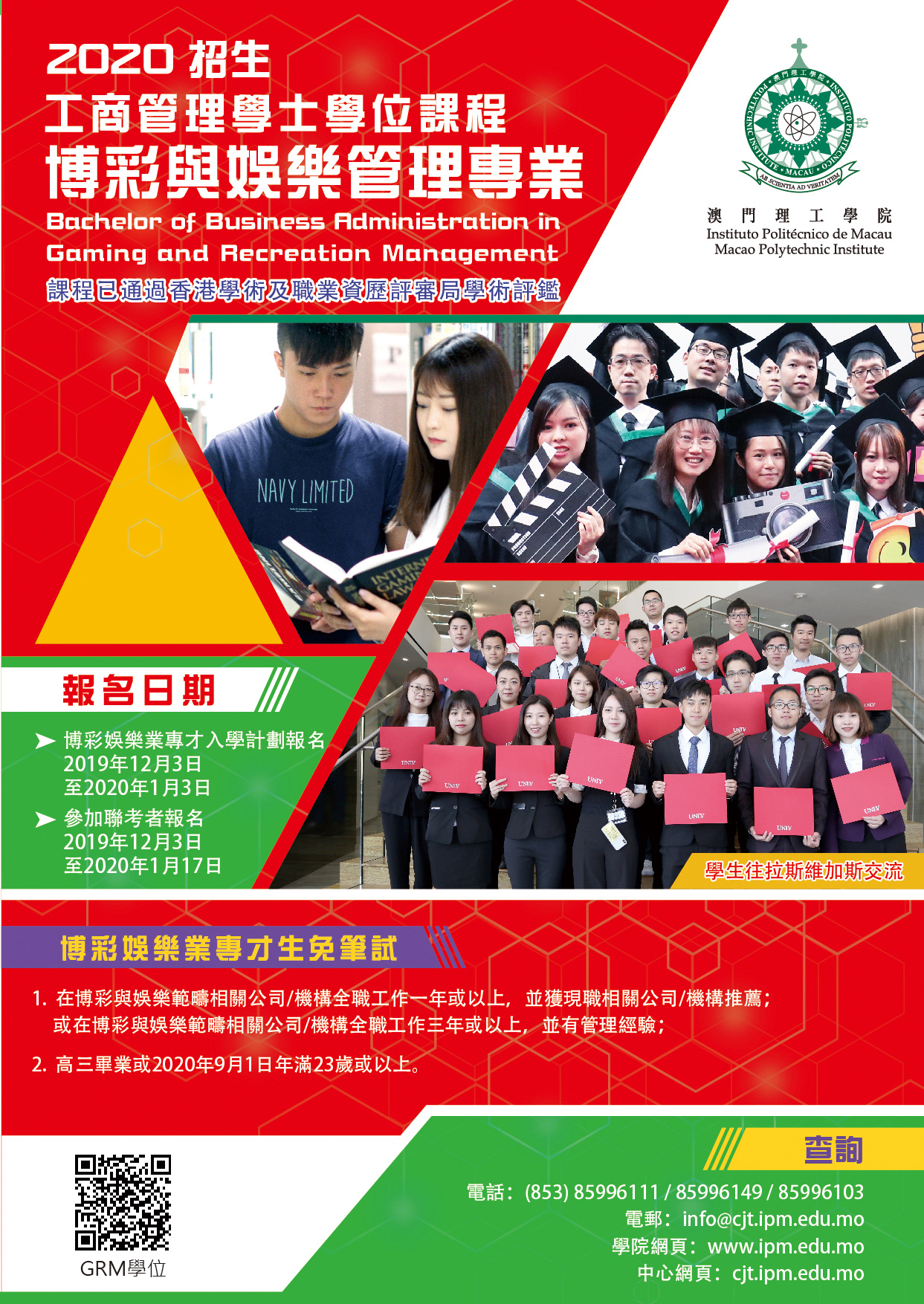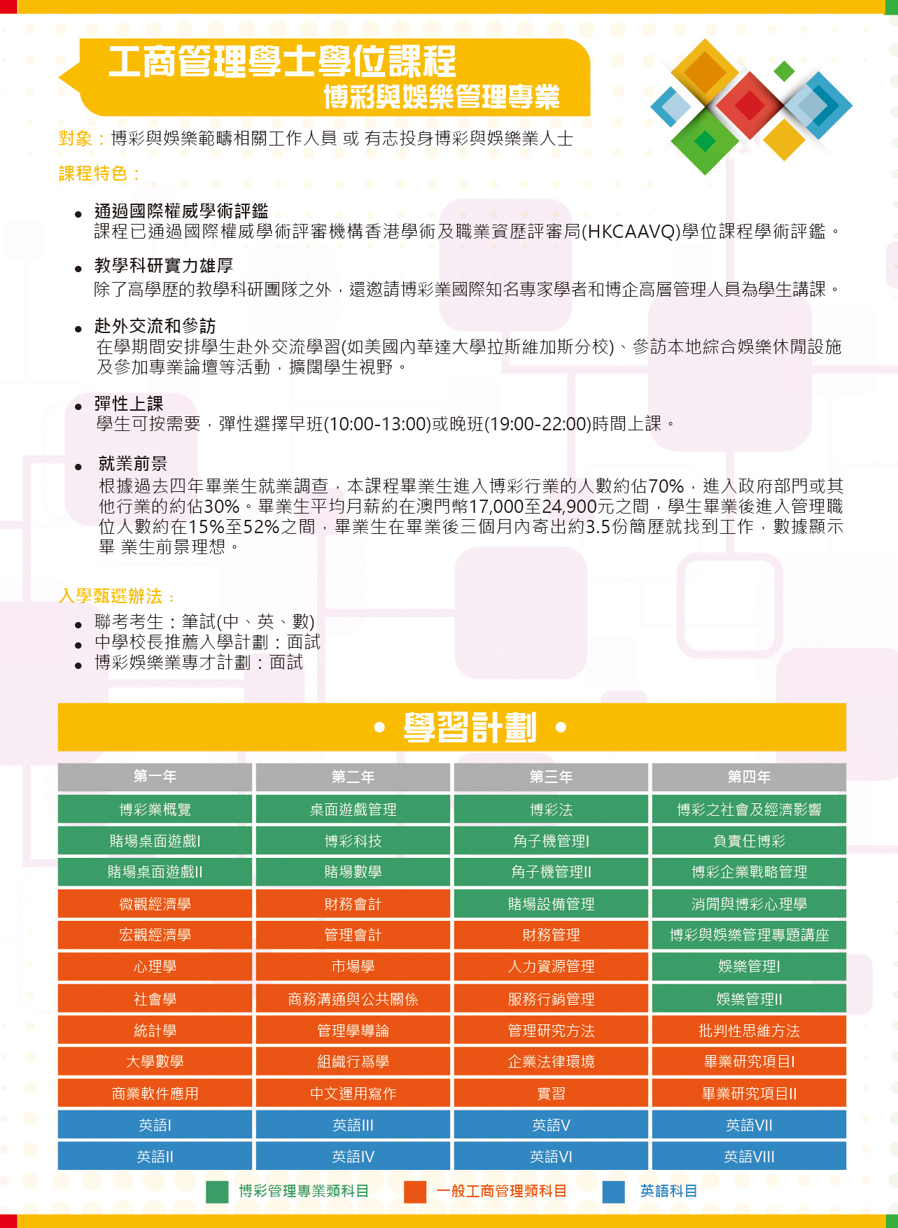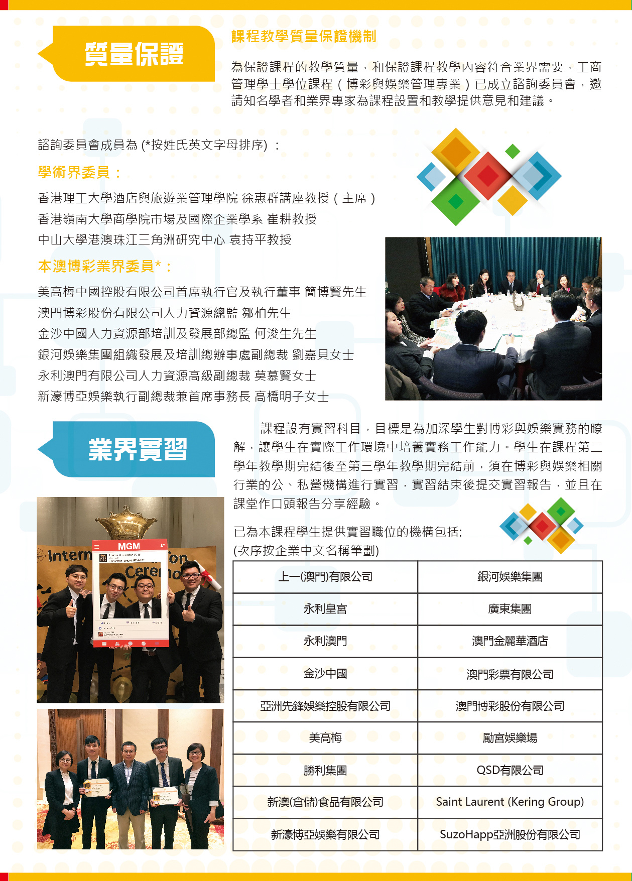 The objectives of the internship for the students of the Bachelor of Business Administration in Gaming and Recreation Management is to enhance students’ understanding of the actual work environment in the gaming and recreation industry, in order to develop their practical skills at work. After completing the second year of study, students will undertake the internship either at local or overseas public organizations or private enterprises related to the gaming and recreation industry. The internship should be concluded before the end of the third year of study, with a written report and oral presentation in class.